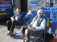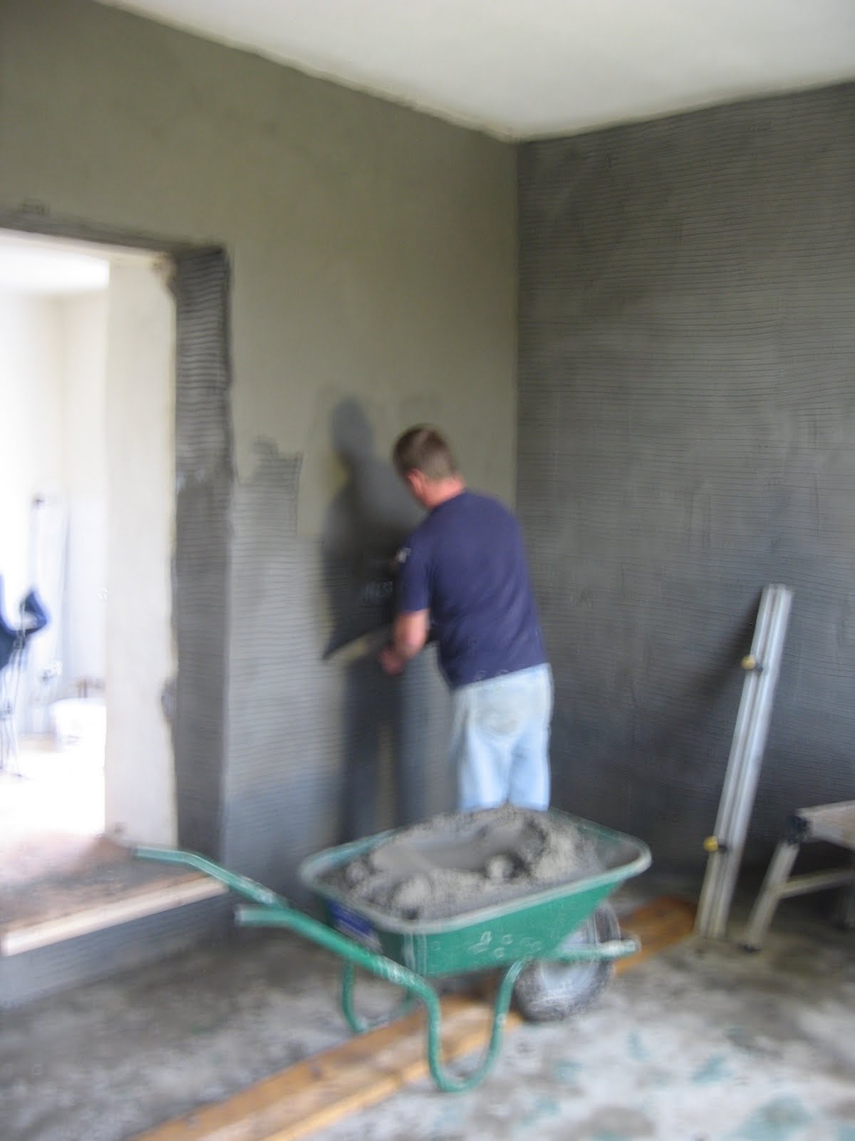 The room's walls have now receieved its 2 coats of waterproof tanking, scratch coat and final plaster layer. The toilet area is looking great and the "loo" has arrived - but as yet not fitted. The photos show the damp proofing tanking specialists Steve and Anthony from the company AD Ltd.